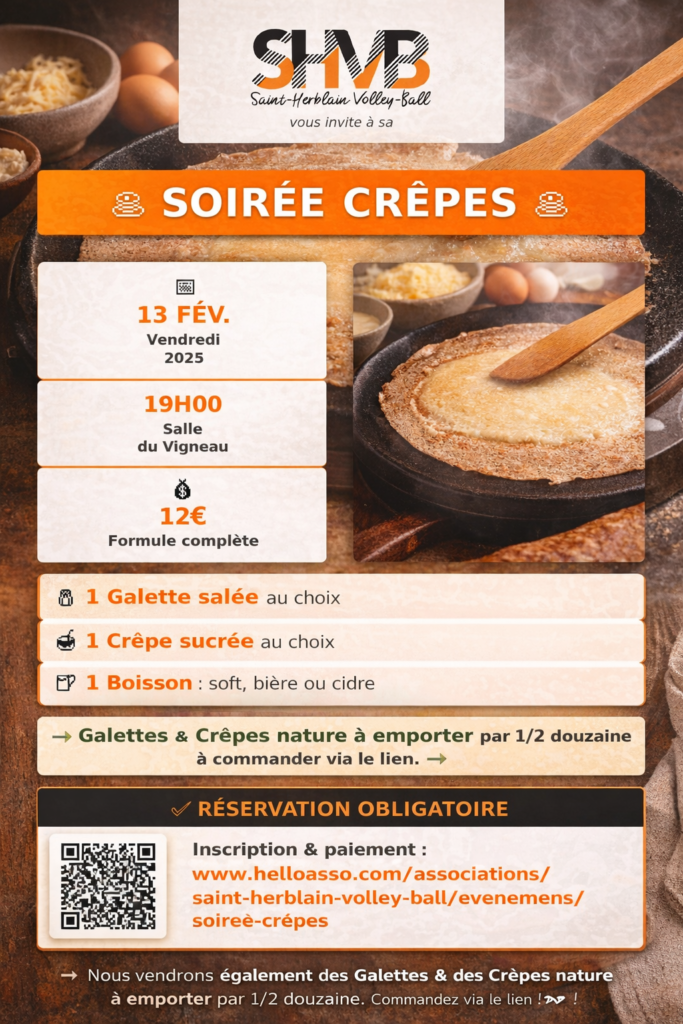 Venez déguster des crêpes le vendredi 13 février à la salle du Vigneau dès 19h. Un menu proposé et une réservation imposée!
